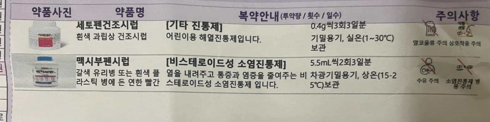 하날이가 처방받은 약은 세토펜건조시럽과 맥시부펜시럽인데 3시간 간격으로 먹일 수 있다고 했다.